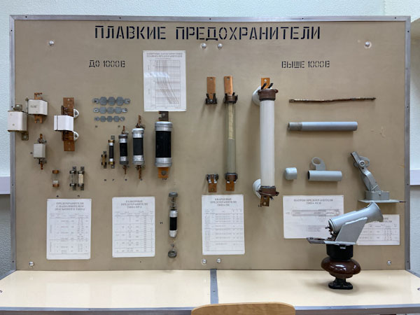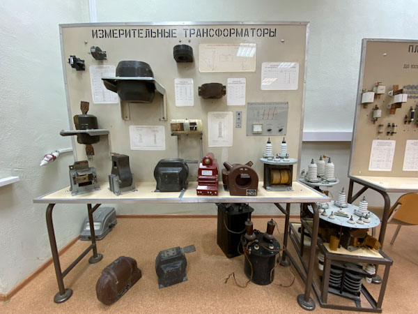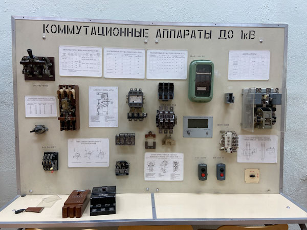 В аппаратном зале представлено оборудование среднего и низкого напряжения: выключатели, предохранители, трансформаторы тока и напряжения, шинные конструкции, контакторы и магнитные пускатели. Для изучения конструкции и принципов работы аппаратов, помимо оборудования в сборе, также представлены его разрезы и отдельные конструктивные элементы. В макетном зале представлены масштабные модели открытых распределительных устройств, что позволяет студентам изучать из компоновки.